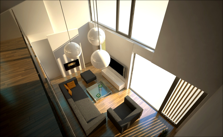 Budynek rozplanowano na 4 poziomach, rozdzielając w sposób naturalny poszczególne strefy. Dominującą przestrzeń we wnętrzu stanowi dwukondygnacyjny salon, przepełniony światłem poprzez znacznej wielkości przeszklenia od strony południowej (od ogródka).